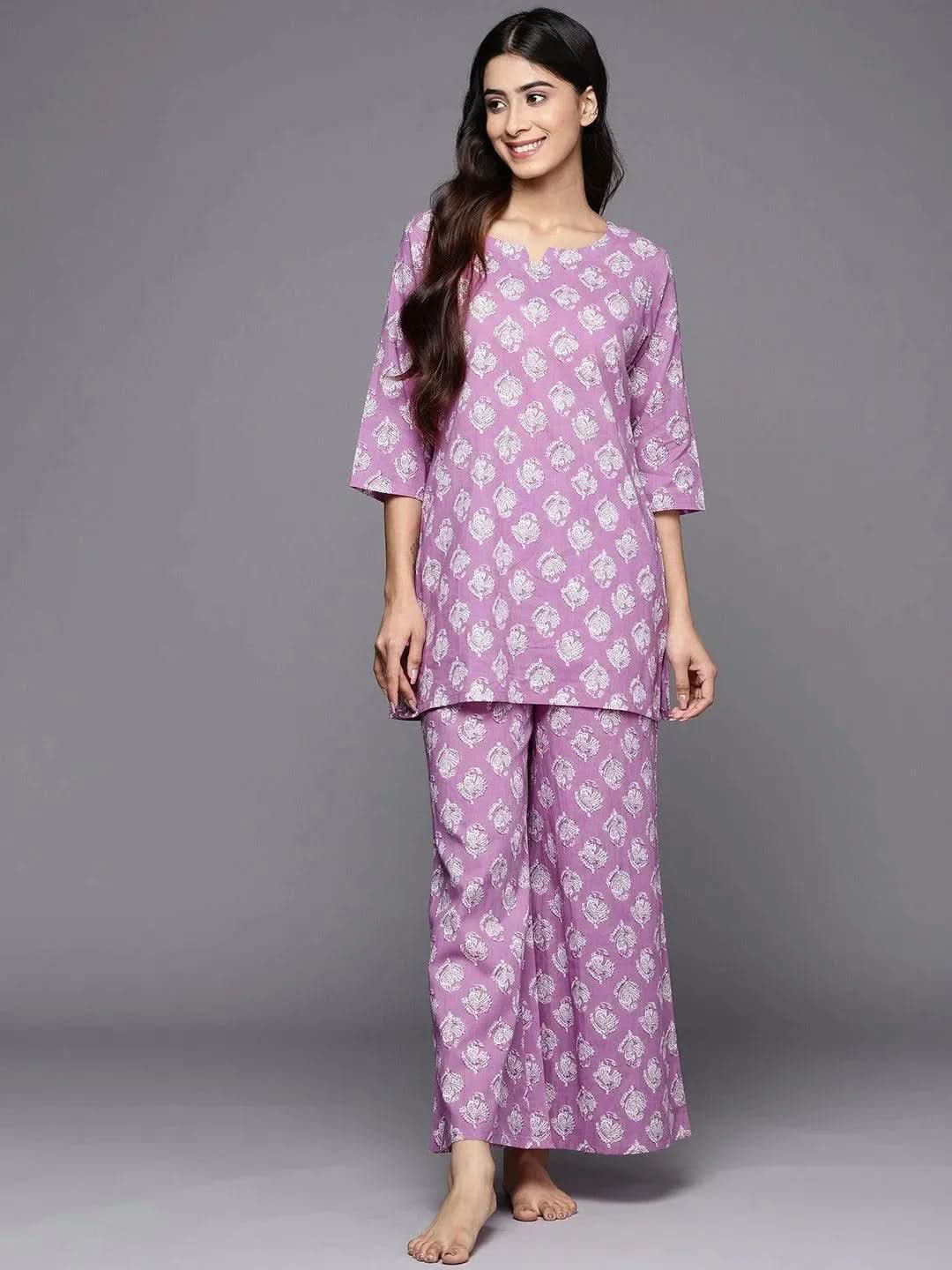 Our 2-piece mauve ethnic motifs printed cotton night suit set features a short kurti with a notched neckline and three-quarter sleeves, and flared pyjama pants with a partially elasticated waistband and roomy pockets. This comfortable style is ideal for effortless everyday wear.