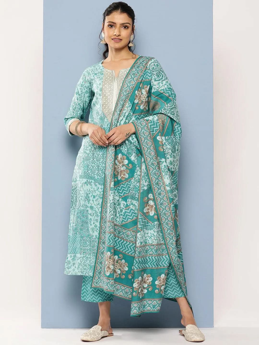 Our 3-piece blue printed silk blend suit set features a straight-fit floral print kurta with a notched neckline, three-quarter sleeves, and a statement yoke. Complemented with chevron print straight pants with a partially elasticated waistband and roomy pockets, and a dupatta in a matching print. Adorned with intricate embroidery delicate Gota Patti and sequins accents, this charming style is ideal for daytime festivities.