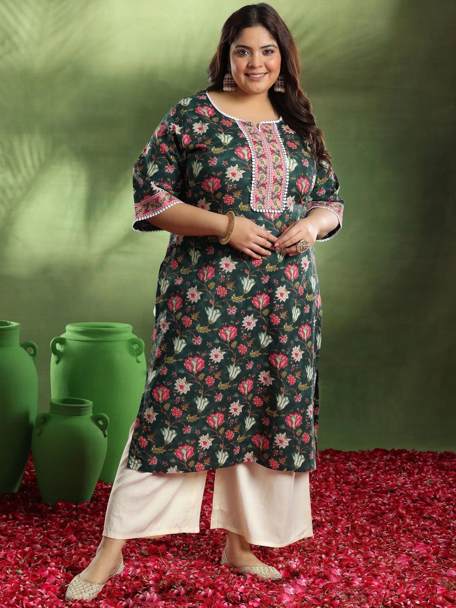 Libas Extra Love collection features our signature designs in comfortable plus sizes. Our green and pink plus-size straight-fit cotton kurta highlighted by a floral-inspired print features a notched neckline and three-quarter sleeves. Adorned with a delicate fabric trim accent, this charming style is ideal for work and beyond.